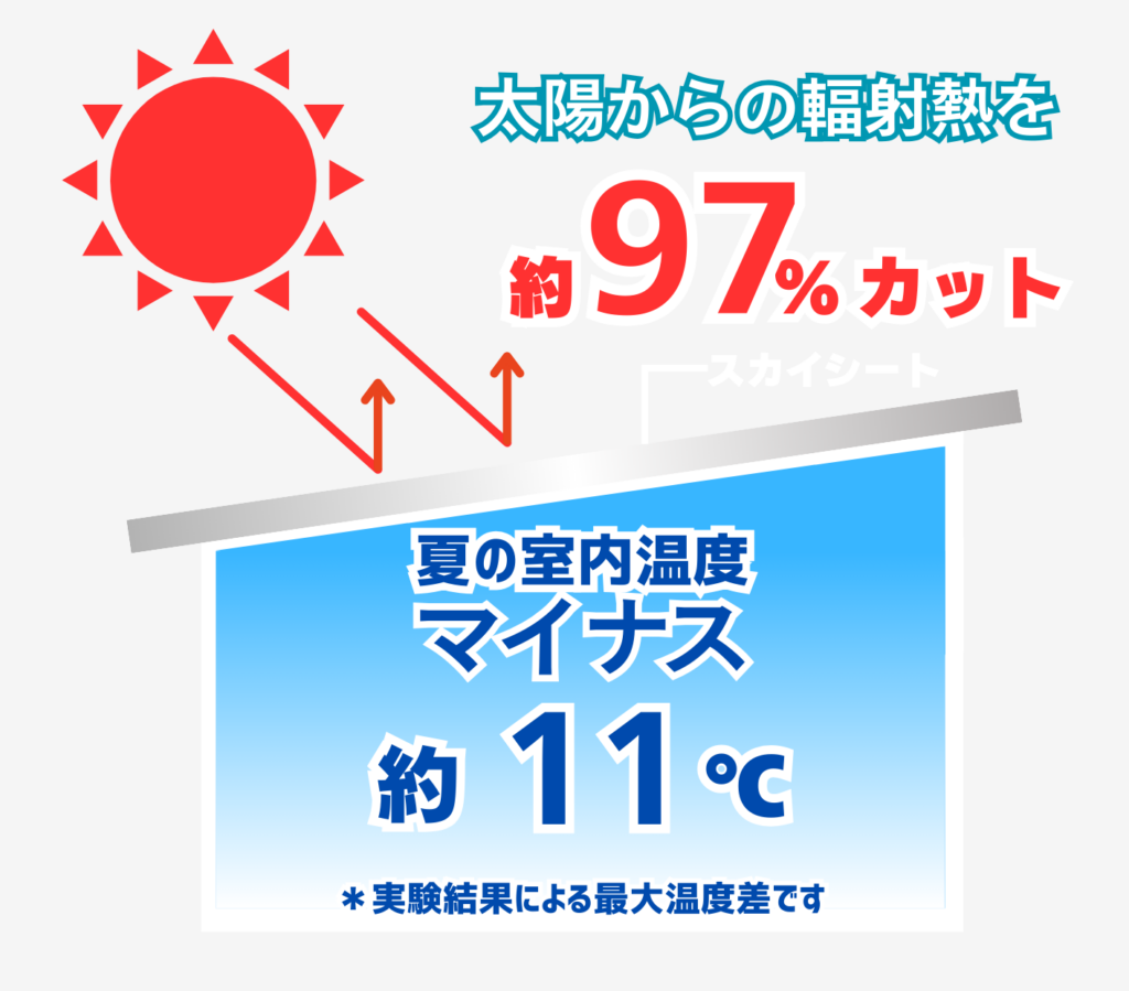 スカイ工法で用いるスカイシート(遮熱シート)は、反射率97%のアルミ箔により太陽からの輻射熱による折板屋根の温度上昇を大幅に抑えます。