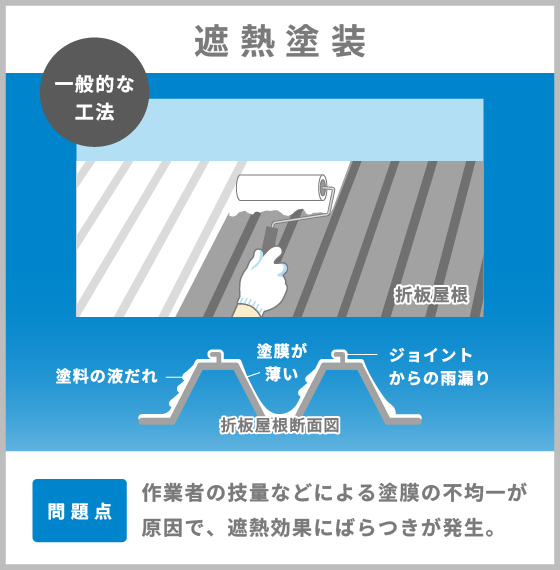 従来、折板屋根の熱対策として遮熱塗装が広く行われてきました。遮熱塗装は太陽の熱を反射し折板屋根の温度を大きく低下させる工法として多くの工場、店舗で採用されてきましたが、その効果が出たり出なかったりとばらつきが発生していました。